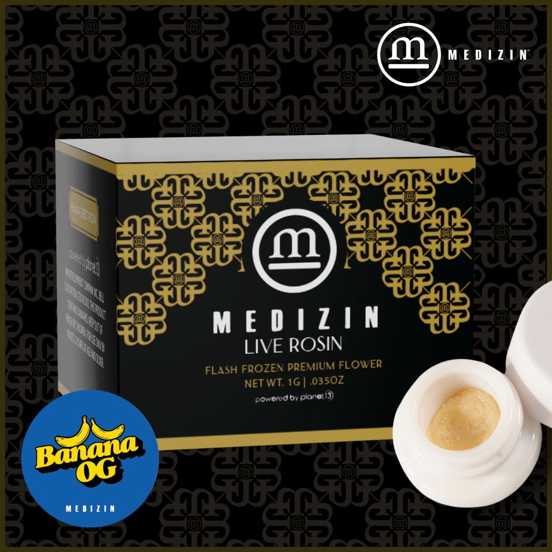 Banana OG Live Rosin is crafted from Banana OG (Ghost OG × Sagarmatha’s 60/40 Original Banana), bred by Orgnkid and selected and cultivated by Medizin Las Vegas. Made from fresh frozen flower and pressed bubble hash, this live rosin preserves the strain’s vibrant terpene profile. Expect bold aromas of ripe banana and tropical fruit layered with subtle notes of earth and citrus. The flavor is smooth and expressive, delivering creamy banana up front with a mellow, fruity finish that lingers on the palate. With its glossy, terpene-rich consistency and clean bubble hash melt, Banana OG Live Rosin delivers a true-to-strain expression.