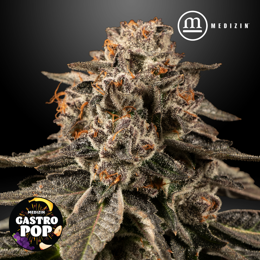 Gastro Pop is a unique strain from Compound Genetics, blending Apples and Bananas with Grape Gas to create a distinctive “Candy Gas” flavor. Its medium-sized, dense buds showcase deep emerald greens, royal purples, and fiery orange pistils, all coated in sparkling trichomes. The aroma bursts with fruity sweetness, reminiscent of a candy store, while the flavor harmonizes sweet apples and bananas with grape gas undertones. Gastro Pop offers a balanced high that starts uplifting and creative, gradually leading to soothing relaxation.