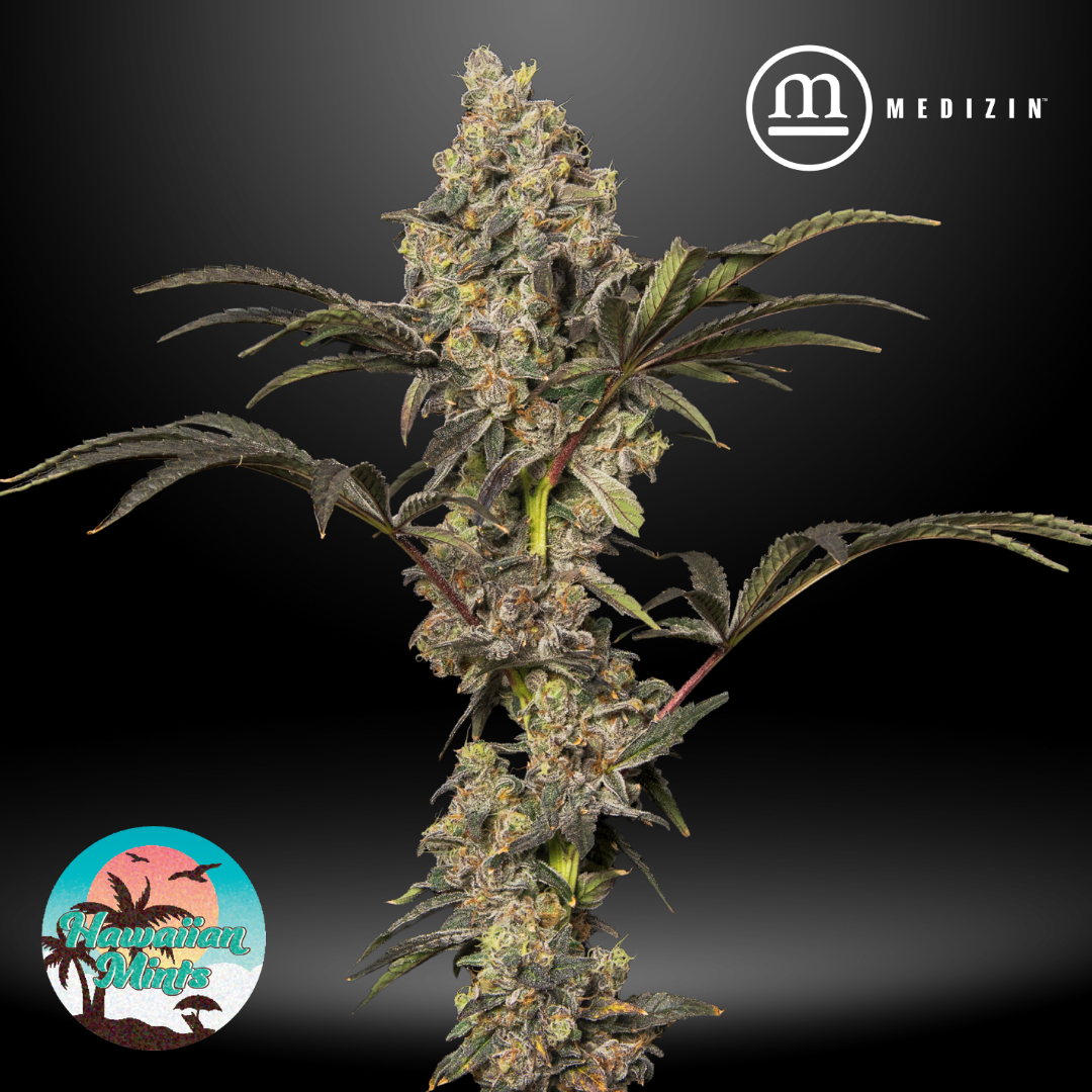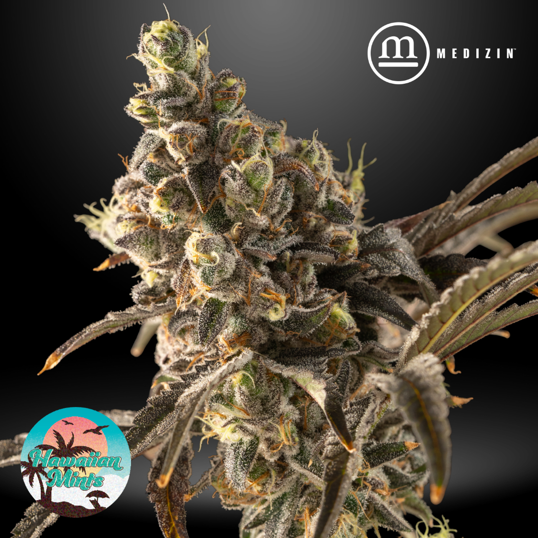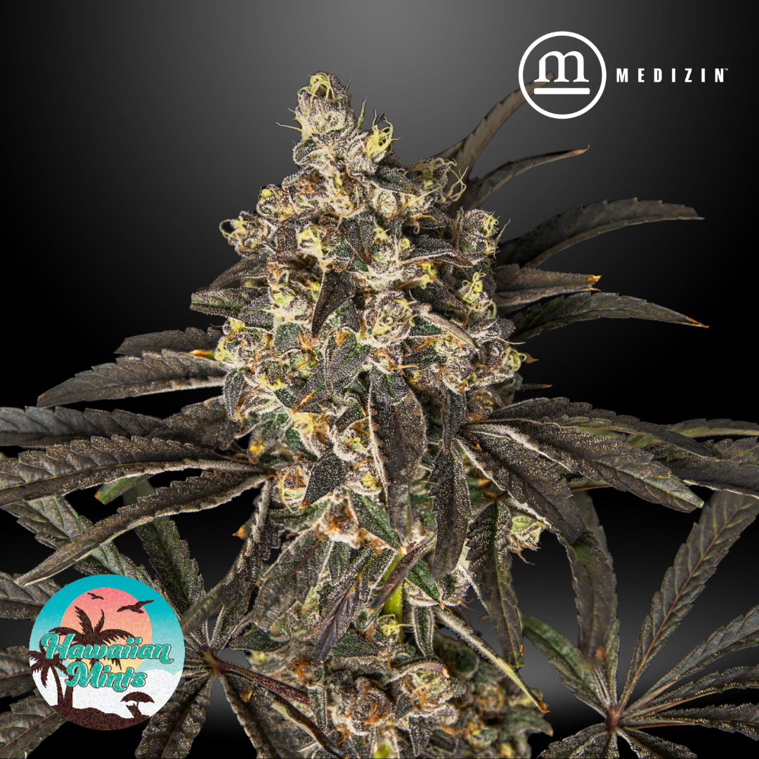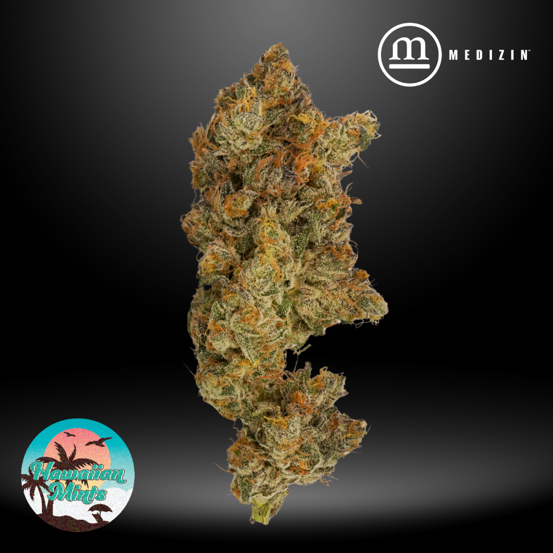 Hawaiian Mints is a vibrant cross of Blue Hawaiian and Kush Mints, offering a tropical, minty aroma with notes of pineapple, blueberry, and a cool herbal finish. The flavor mirrors the nose—sweet, fruity, and refreshingly smooth with a lingering minty exhale. Its dense, light green buds are dusted in glistening trichomes and accented by fiery orange pistils. Known for its potent and balanced effects, Hawaiian Mints delivers a euphoric cerebral lift followed by calming body relaxation, making it a versatile option for both daytime and evening use.